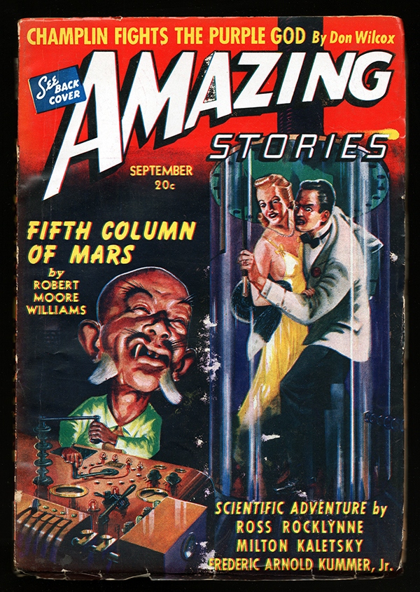 Typical Ray Palmer-edited issue with an author lineup of his most worthy regulars. Cover by Robert Fuqua. Condition: Fine to Fine Plus. Extremely clean and glossy copy with a few tiny nicks to cover edges. Text block is lightly yellowed but extremely supple. A top-notch example of Amazing in the immediately pre-WWII period.