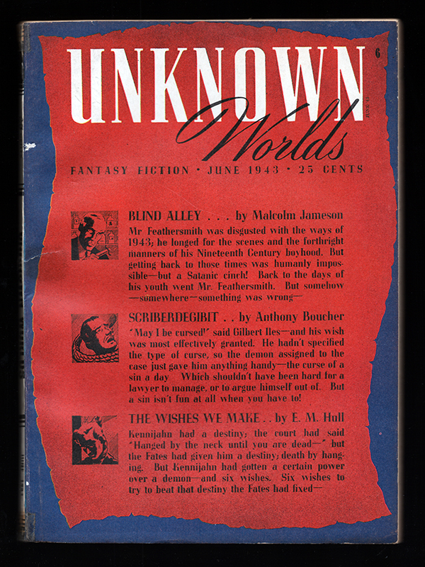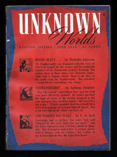 A late issue (there would be only two more) of the classic fantasy pulp edited by John W. Campbell, with stories by such genre favorites as Theodore Sturgeon, Manly Wade Wellman, Anthony Boucher, and E. M. Hull among others. Condition: This would grade Near Fine to Fine but for two small but discolored pieces of tape wrapped around head and heel of spine. Text block is off-white.